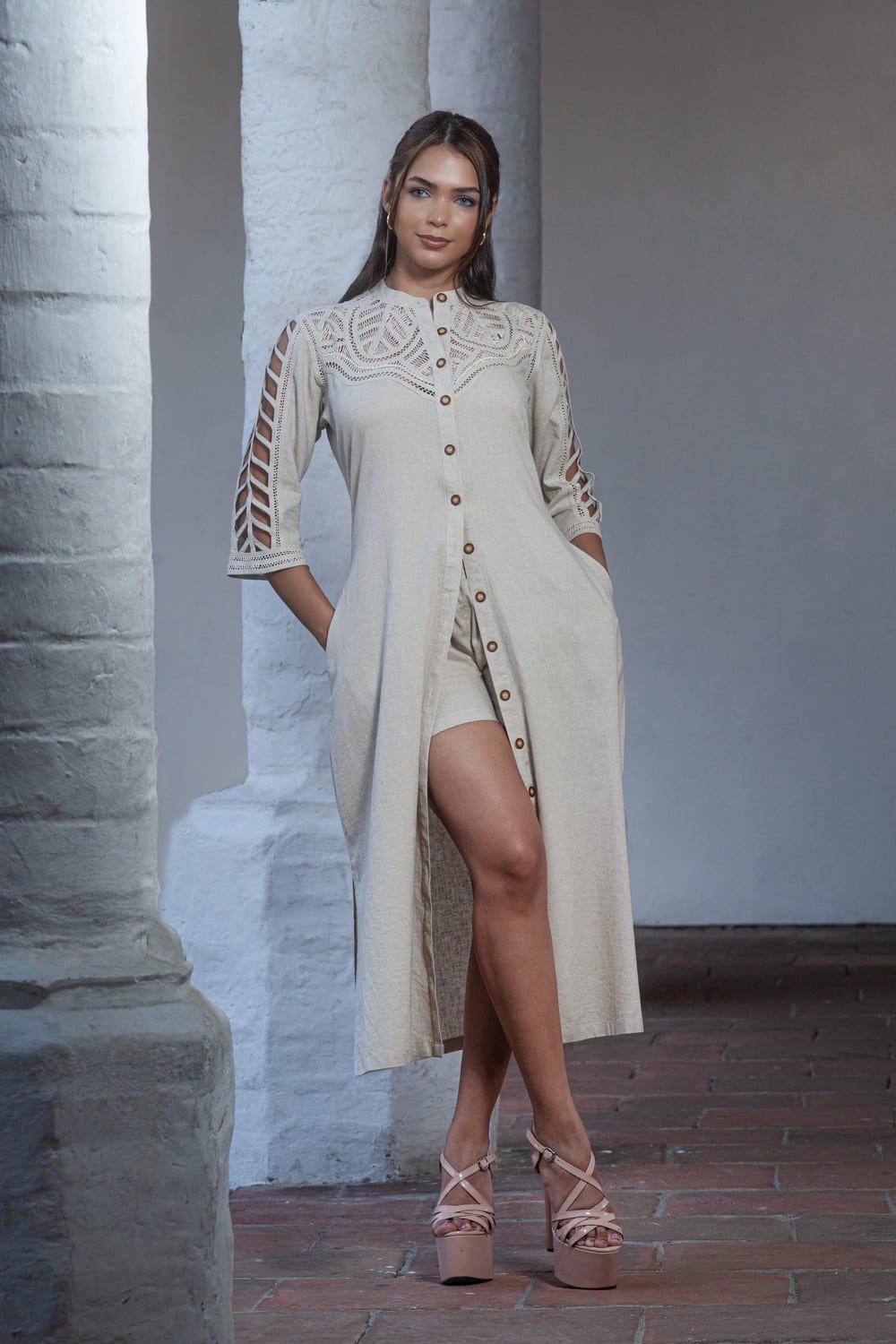 Caftán bordado palo rosa en tono arena, con calado lateral que resalta la figura y frescura. Esta prenda hace parte de la colección Amor Eterno de Frixio, un homenaje a las madres. El caftán, también conocido como kaftán o kaflan, es sinónimo de elegancia artesanal hecha a mano.