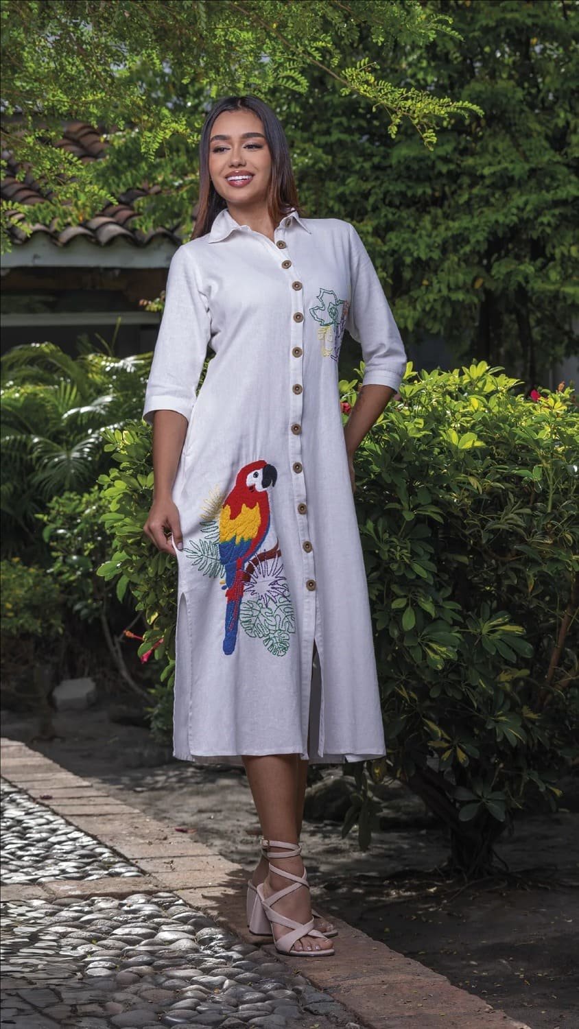 Los detalles del bordado a mano realzan este vestido, dándole un toque artesanal único. Con colores vivos que representan la fauna colombiana, cada vestido bordado a mano para mujer cuenta una historia de tradición y arte. Este vestido artesanal moderno combina elementos elegantes con un diseño contemporáneo, ideal para quienes valoran la exclusividad y la moda sostenible.